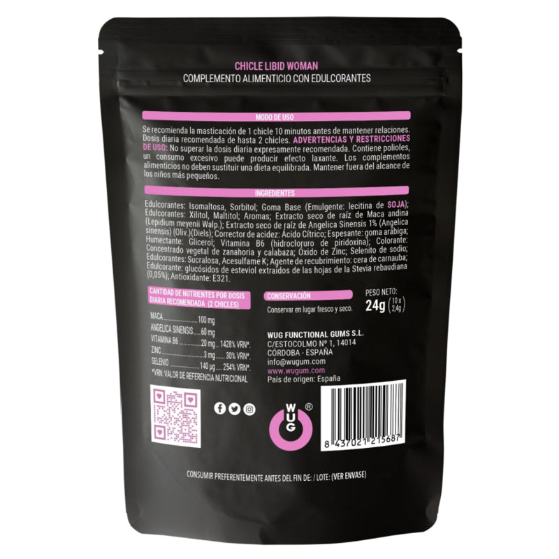 A goma LIBID WOMAN incorpora 30 mg de ANGELICA SINENSIS, mais conhecida como "Ginseng Feminino" que aumenta os lípidos nas mulheres, potenciando o fluxo sanguíneo na zona vaginal e 1,5 mg de ZINC que aumenta a fertilidade contribuindo para a reprodução normal. Também inclui Maca, Selênio e Vitamina B6.